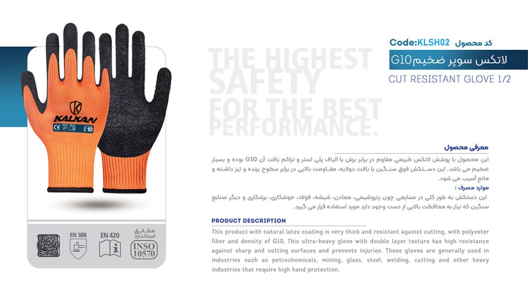 دستکش ضد برش سوپر G10 کالکان نیز مانند سایر مدلهای تولیدی این کارخانه دارای استاندارد EN388 و EN420 میباشد.