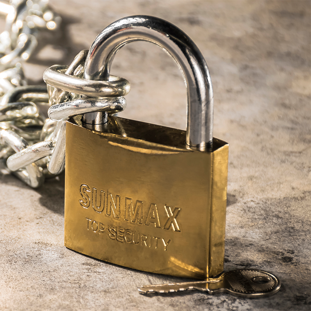 قفل آویز با روکش برنج SUN MAX با میلهU شکل قفلی قابل حمل می باشد. میله U شکل این قفل از جنس استیل آبدیده، بدنه با پوشش برنج و سیلندر از جنس برنج می باشند.
